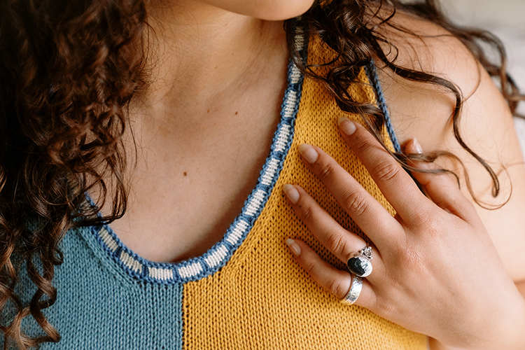 Before I was done with that process, Pom Pom Quarterly’s former editors reached out with an exciting proposal for the pattern. Post-magazine, they’d begun to partner with yarn companies to produce high quality pattern collections. They wanted to include designs from the would-be current issue of Pom Pom Quarterly in a new collection for Hobbii yarn, including my Bevelled Tank. I worked with the same technical editors I would have for the magazine on this one, and as you can see from the photos, Pom Pom’s team did an amazing job of styling the garment to the beautiful standards they’re known for.
