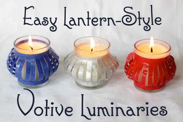 Gluing the paper on slightly in from the top and bottom edge of the votives makes the middle of the paper slits flare out for a cute lantern effect. Festive, right?