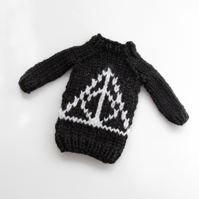 Grab your most magical needles and cast on this mini sweater inspired by a certain bespectacled wizard boy and his friend’s mom’s knitting habit. The Mini Magic Symbol Sweater makes a great gift topper, holiday ornament, beer bottle cozy, or keychain, and it’s a great way to show off your favorite fandom! Ten points to the knitter who uses this pattern as a springboard to knit a mini sweater featuring their own first initial!